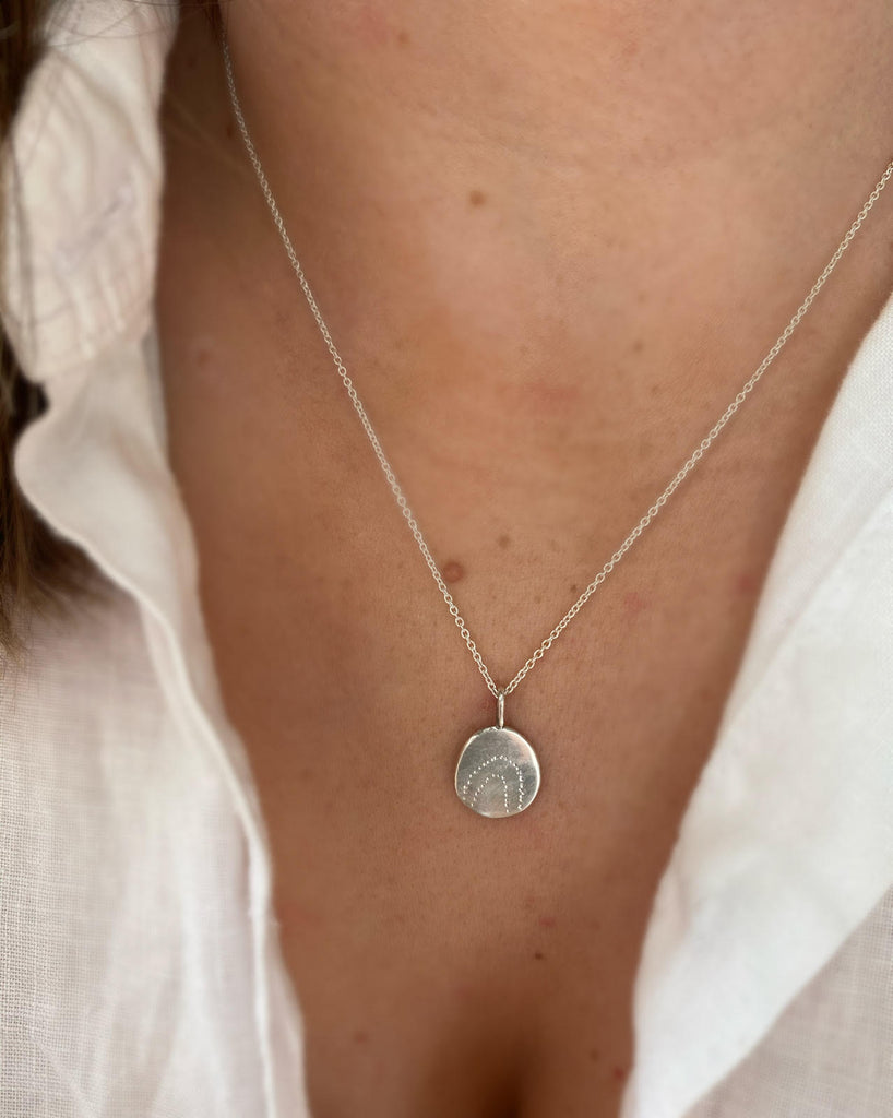 Handmade pendant from recycled sterling silver offcuts, melted and forged to form a dainty pendant with organic and unique rainbow. Sitting on a delicate 45cm cable chain.